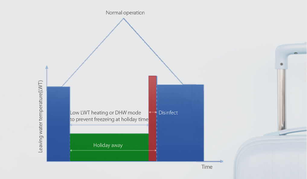 Функція «Відпустка» — це режим, призначений для підвищення надійності системи та економії енергії. Пристрій працює в режимі опалення та/або в режимі гарячого водопостачання з низькою температурою води, щоб запобігти замерзанню води взимку під час відсутності користувача. Користувач може заздалегідь встановити режим дезінфекції перед поверненням додому, щоб забезпечити наявність чистої та безпечної для використання гарячої води.