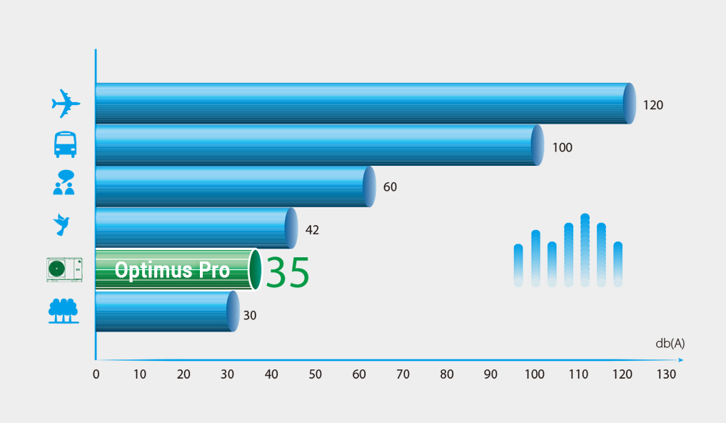 Завдяки високому рівню оптимізації технічних рішень рівень звукового тиску теплових насосів NØRDIS Optimus Pro 4 кВт становить лише 35 дБ(A) на відстані 3 метрів.