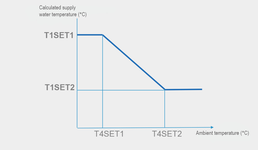 Завдяки функції погодозалежної температурної кривої температура води автоматично змінюється відповідно до зміни температури зовнішнього повітря. Коли температура зовнішнього повітря підвищується або знижується, теплове навантаження відповідно зменшується або збільшується, а температура води автоматично знижується або підвищується. Коли температура зовнішнього повітря знижується або підвищується, навантаження на охолодження відповідно зменшується або збільшується, а температура води автоматично підвищується або знижується. Загалом доступно 32 фіксовані погодозалежні температурні криві та одна користувацька крива, що дозволяє задовольнити різноманітні вимоги до температури.